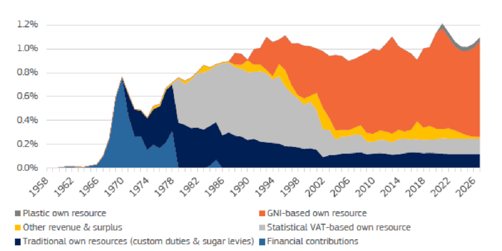 Op zich hoeven daarvoor geen nieuwe eigen middelen te worden aangewezen. Hogere uitgaven kunnen immers worden gedekt door hogere afdrachten van lidstaten volgens de bni-sleutel. Die afdrachten – proportioneel aan het nationaal inkomen van de lidstaten – dekken nu driekwart van de financiering van het EU-budget (zie het oranje vlak in de grafiek).