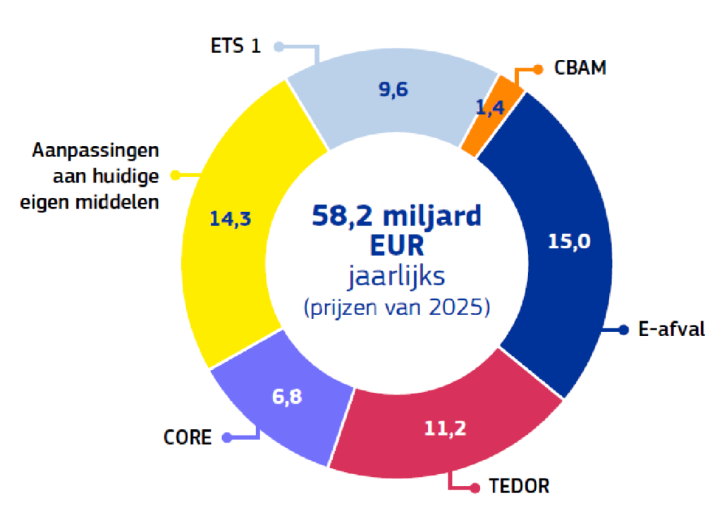 Het diagram laat de verwachte opbrengsten zien: 58,2 miljard euro per jaar. Een kwart daarvan moet komen van aanpassingen in de huidige eigen middelen, zoals een lagere vergoeding voor inningskosten van invoerrechten (van 25 naar 10 procent) en afschaffing van de bestaande afdrachtkortingen. Dat vergroot de transparantie, maar stuit op weerstand van de Nederlandse regering.