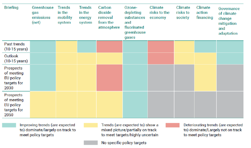 Het rapport van de EEA brengt langjarige ontwikkelingen op de diverse milieu-domeinen schematisch in beeld. Zoals in bovenstaande tabel met beoordelingen van het Europese klimaatbeleid. Daarin worden de vorderingen van afzonderlijke elementen van het klimaatbeleid beoordeeld volgens een stoplichtmodel. Deels ook in relatie tot de doelen die de EU heeft vastgelegd. Waar die doelen ontbreken, zijn de vlakjes (in de rechterhelft van het schema) grijs ingevuld.
