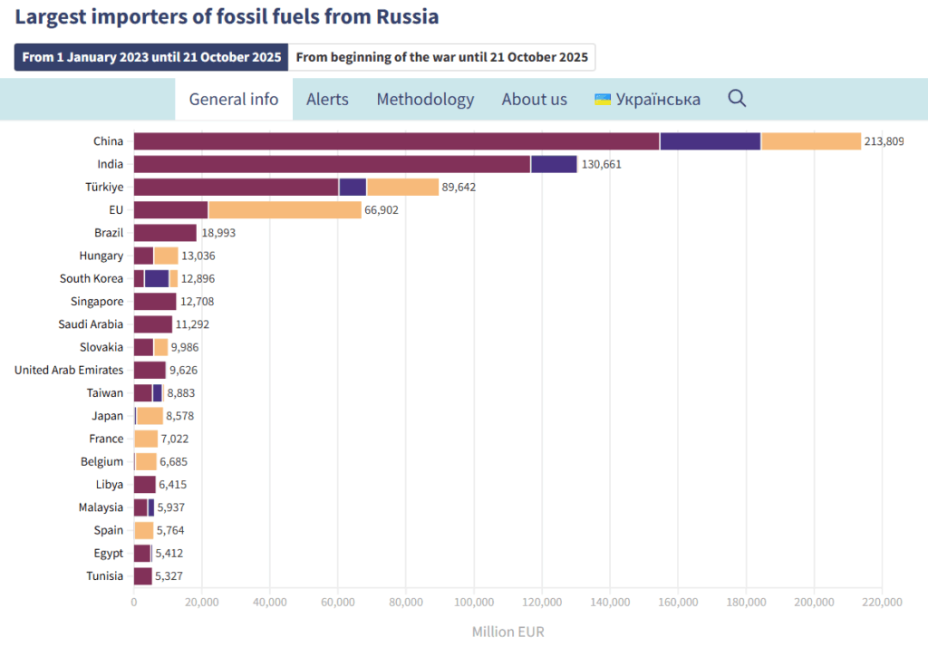 Het Centre for Research on Energy and Clean Air (CREA) houdt een ‘Russia Fossil Tracker’ bij. Op die tracker staan diverse EU-lidstaten hoog genoteerd als importeurs van olie en gas uit Rusland (zie de grafiek). Sinds het begin van de oorlog, in februari 2022, hebben de EU-lidstaten voor maar liefst 215 miljard euro aan fossiele brandstoffen uit Rusland geïmporteerd.