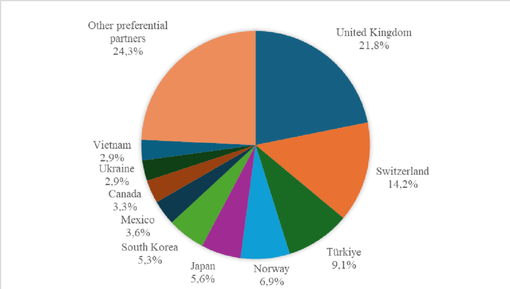 Wel investeert de EU flink in bilaterale handelsovereenkomsten. Inmiddels heeft zij er 44 gesloten, met in totaal 76 preferente handelspartners. En er zitten nog akkoorden in de pijplijn: met Indonesië, Mercosur en Mexico. De grafiek laat zien welke de belangrijkste van die preferente partnerlanden zijn.