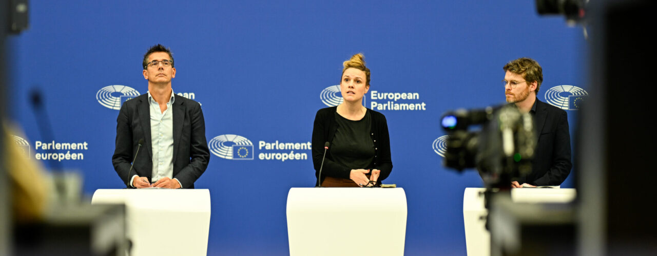 Bas Eickhout (rechts) bij een persconferentie van zijn Europese fractie.