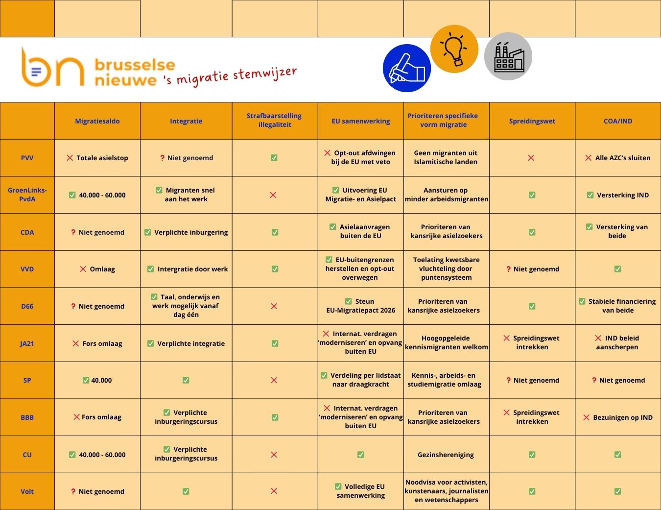 Migratie is opnieuw een van de heetste hangijzers in de verkiezingscampagne. Waar de ene partij pleit voor een asielstop, ziet de andere juist kansen voor Europese samenwerking en snellere integratie. Brusselse Nieuwe zette de standpunten van de grootste partijen in de peilingen naast elkaar: van de PVV die de grenzen wil sluiten tot Volt dat juist pleit voor een humaan Europees migratiebeleid.